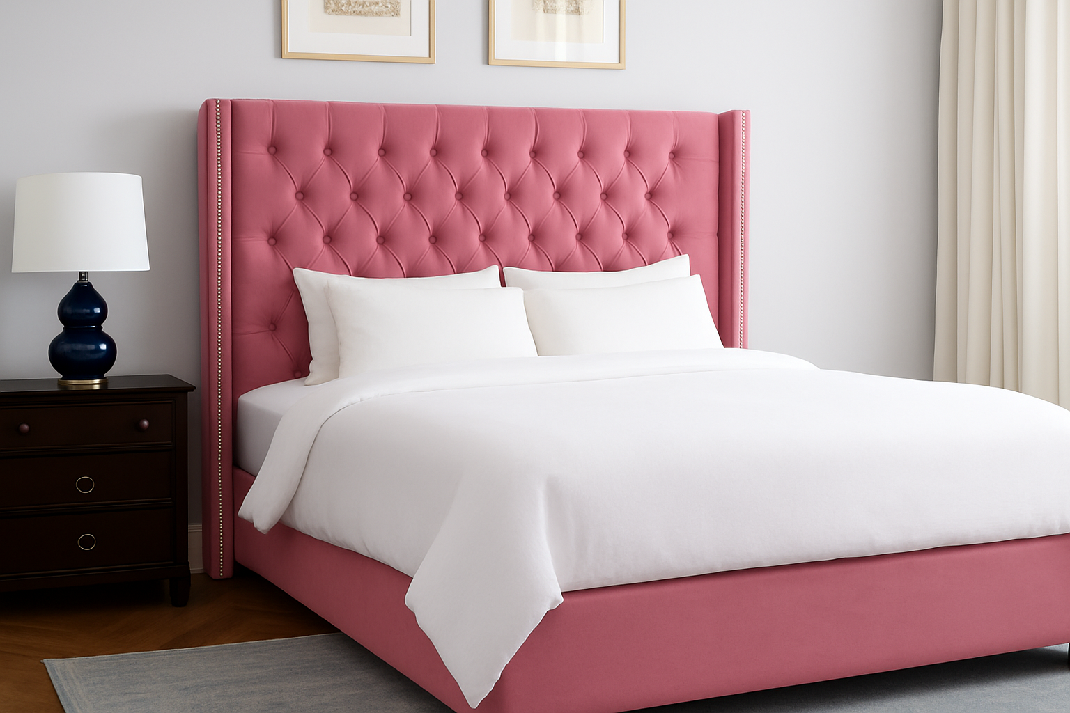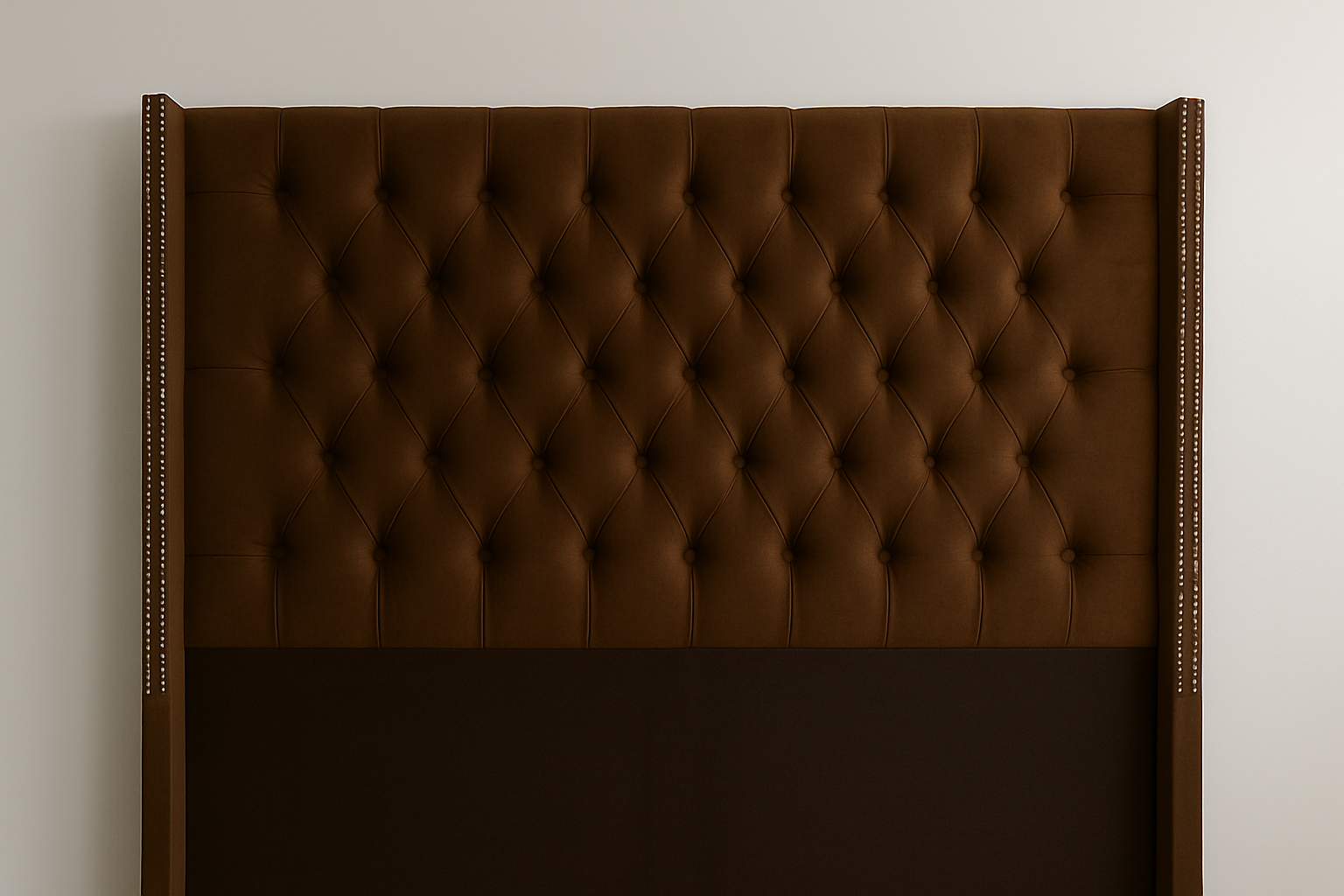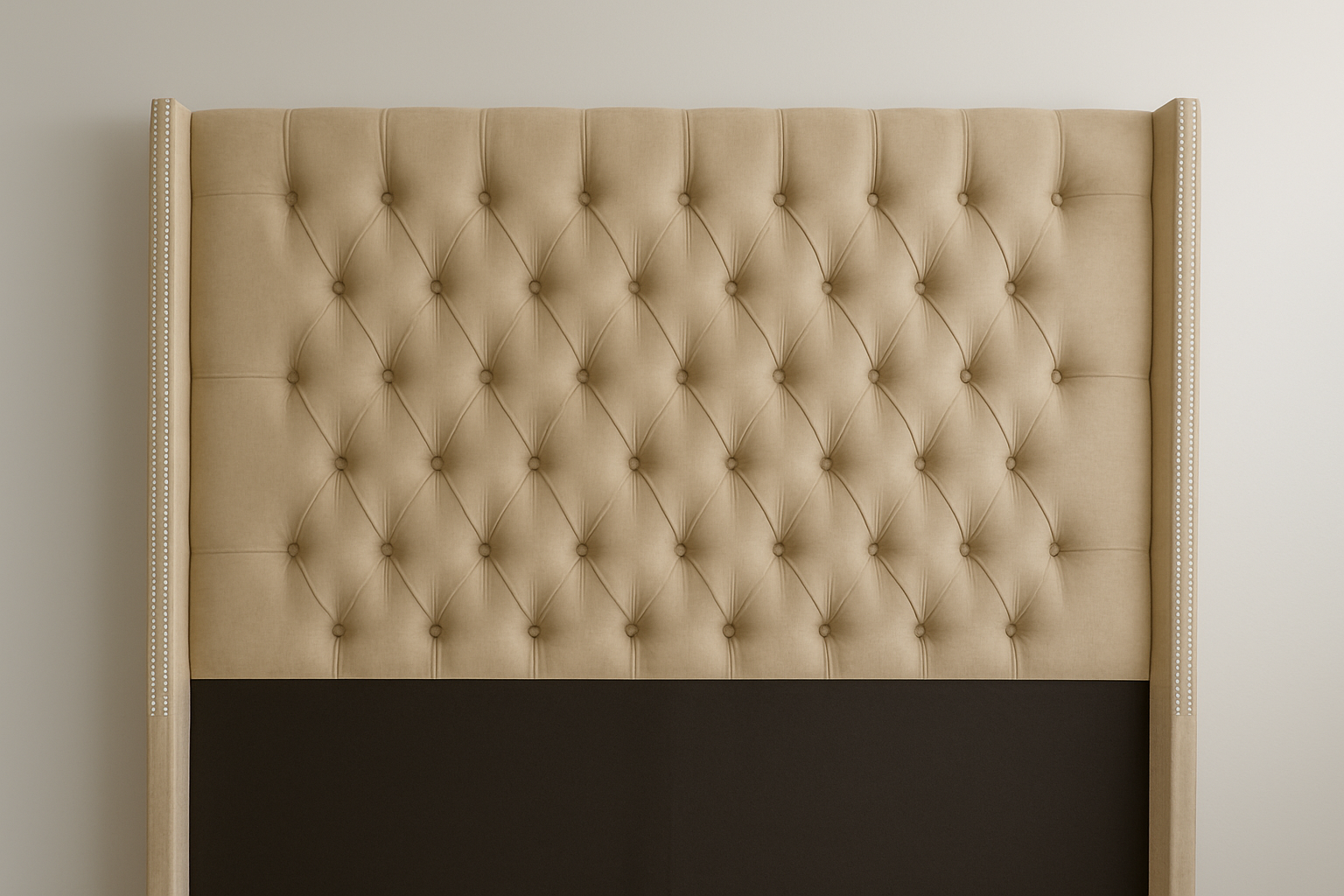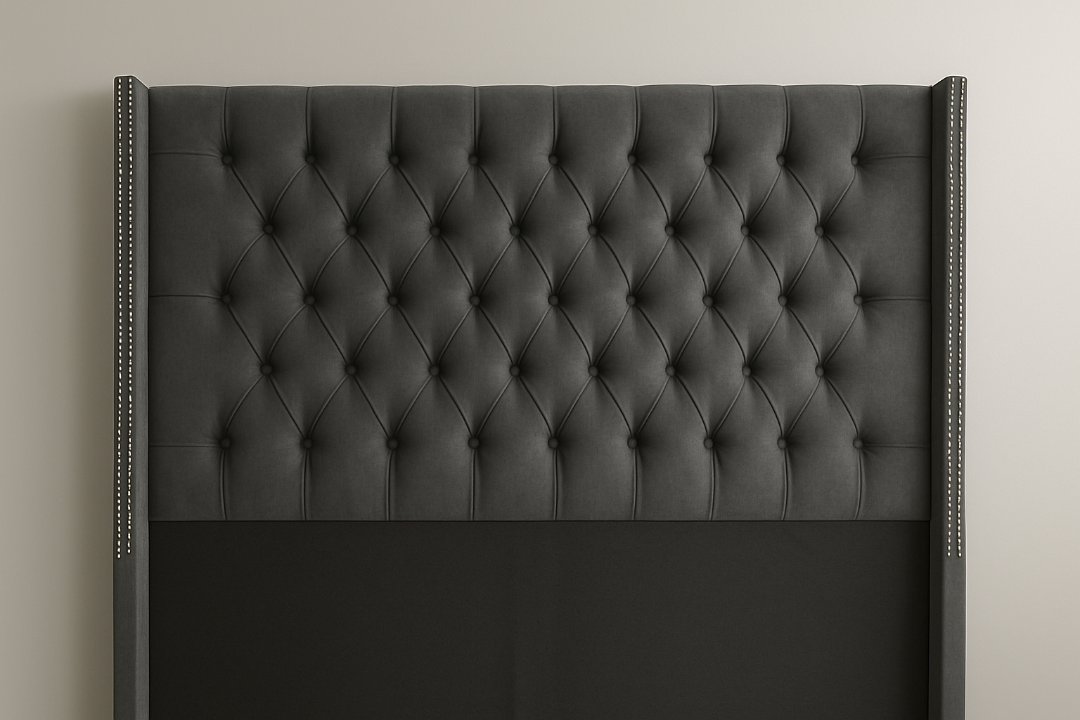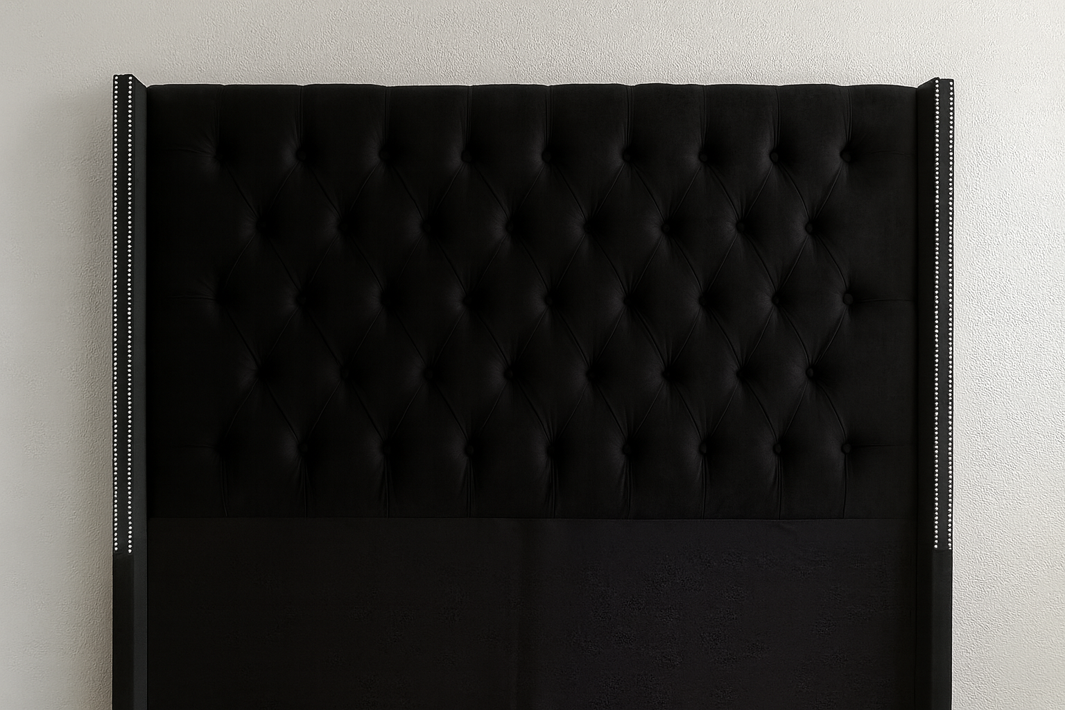 Expertly finished in soft velvet upholstery, the Gaby’s headboard showcases deep buttoning done to perfection, complemented by stud detailing that runs gracefully down the wings, stopping precisely where the mattress begins for a clean, polished look. The buttoning itself is beautifully balanced — it stops where the mattress starts, creating a proportioned and modern finish.