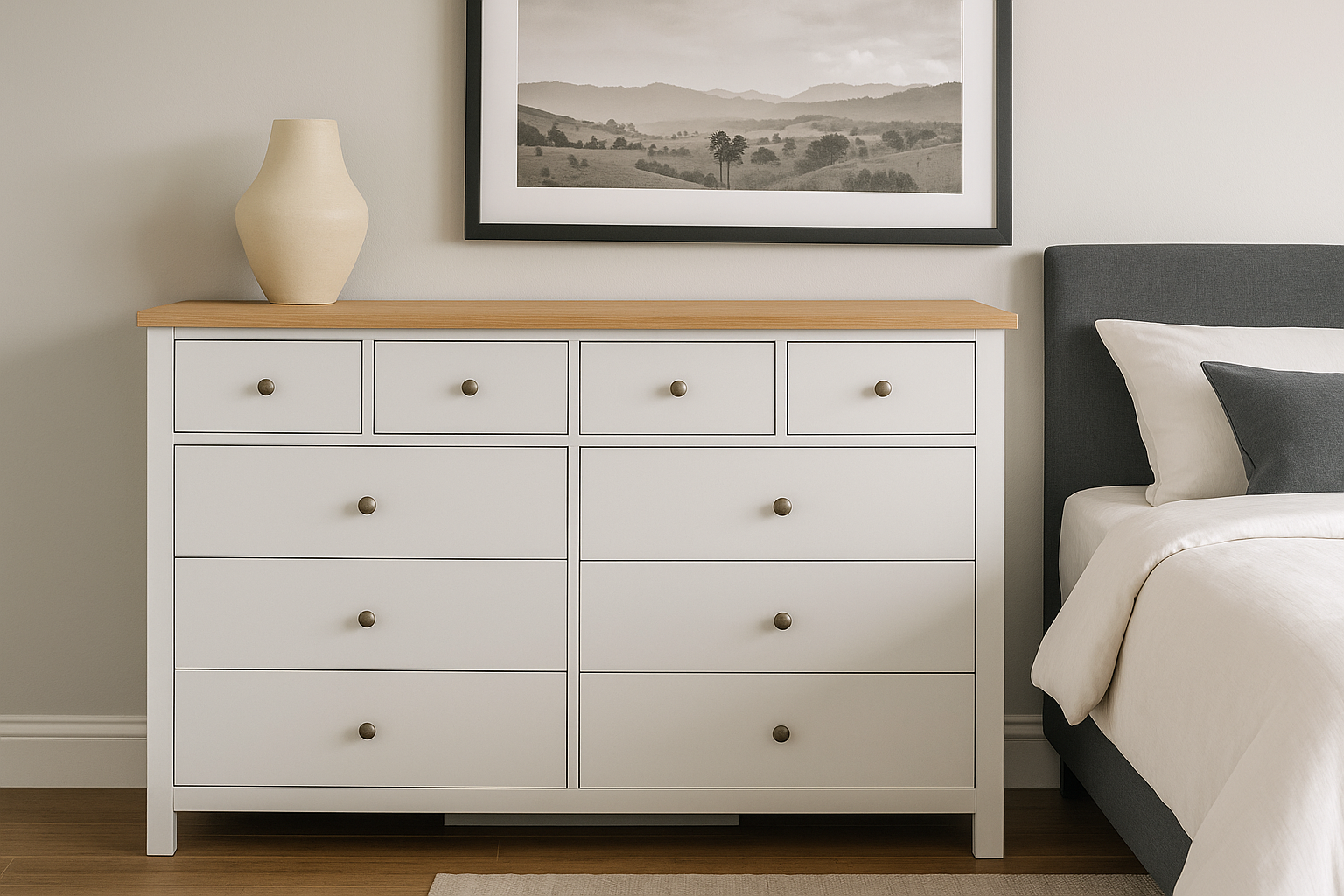 Designed with practicality in mind, the ten spacious drawers provide ample storage, ensuring everything has its place. Plus, with its elevated design, cleaning underneath is effortless—because we know that’s a must for most of us!