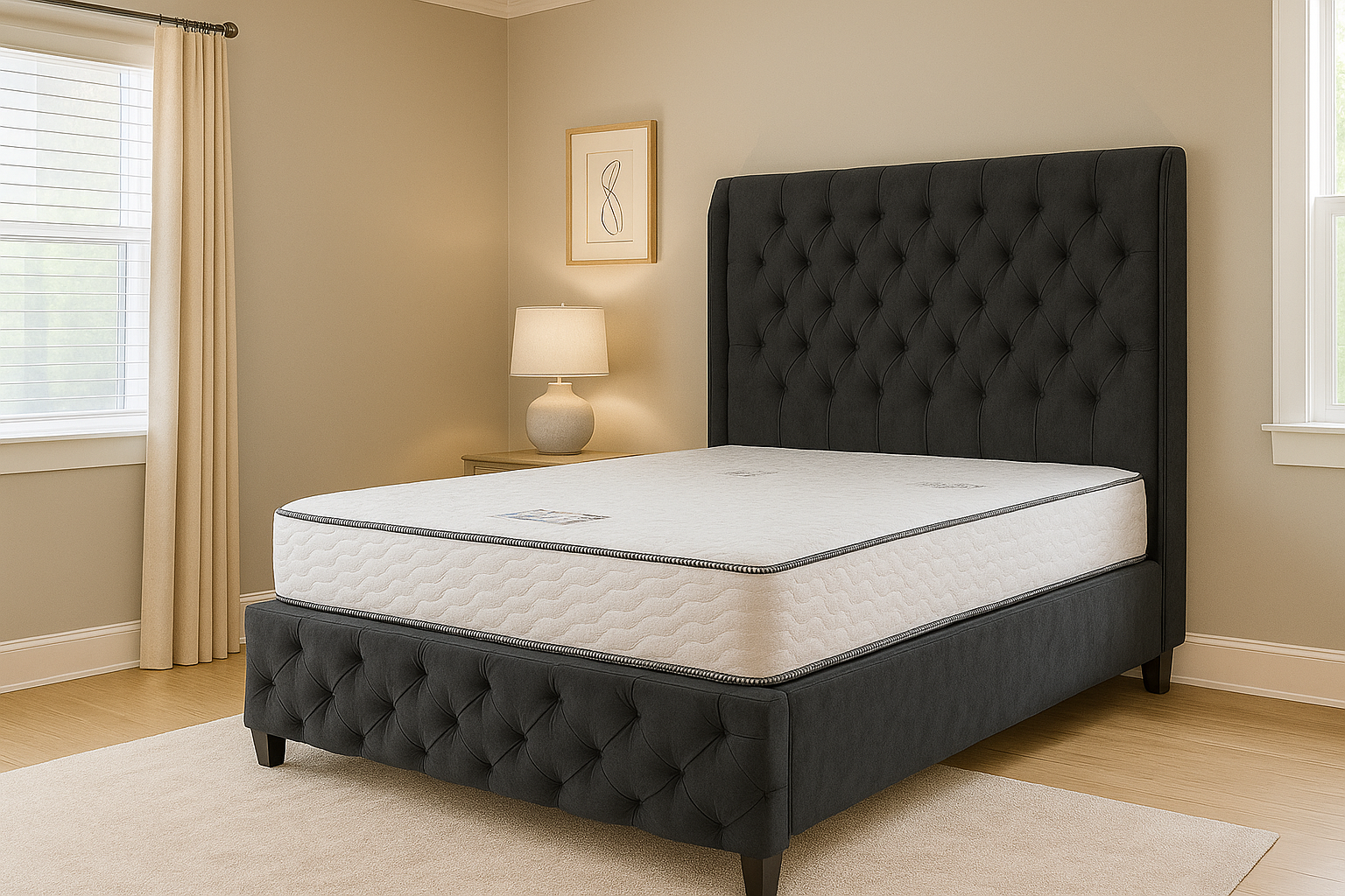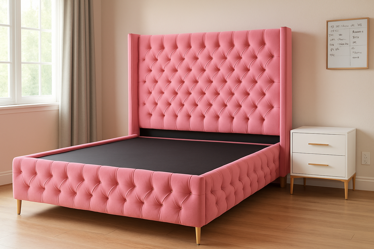 The tall, button-tufted headboard makes a bold statement, while the matching base completes the elegant look. Designed to be the centerpiece of your room, it’s a blend of modern style and classic charm.